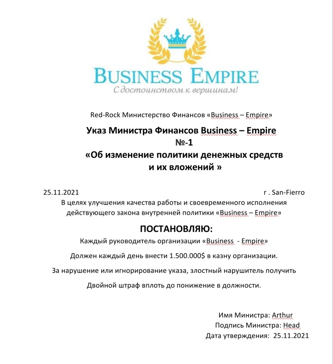 Вы здесь » 💲 Business Empire 💱 » Business Empire | Указы Министра Финансов » Указ №1 от 25.11.2021
